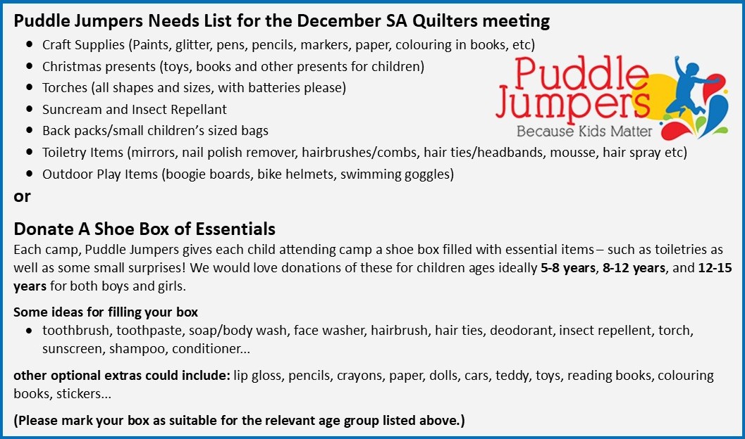 Members and visitors will have time to meet friends, indulge in retail therapy at the attending quilt shop, visit the library or to drop off Quilts of Love, our community quilt program. There is a guest speaker at each meeting, raffle prizes to win, SA Quilters sub-committee reports and an inspiring Show and Tell.