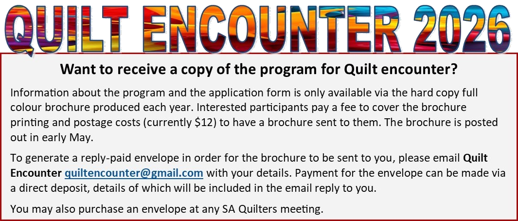 Web site update – 21/10/2025 – Home Page. Please let us know by email at SA Quilters if you spot any errors.