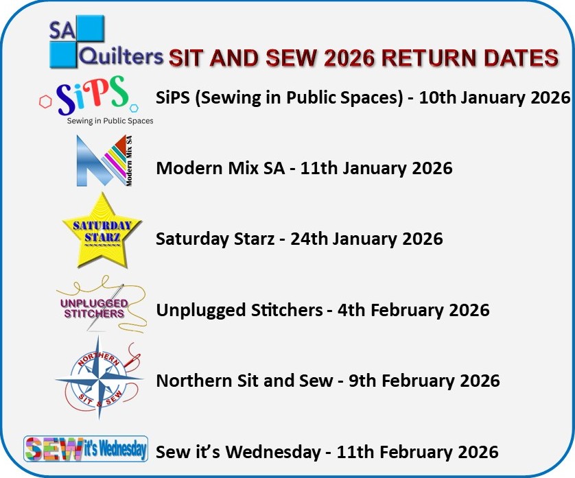 SA Quilters has Sit and Sew days to suit everyone and everyone is welcome. You can find more details by clicking on the Sit and Sew Group Logos below to go to the Sit and Sew page: