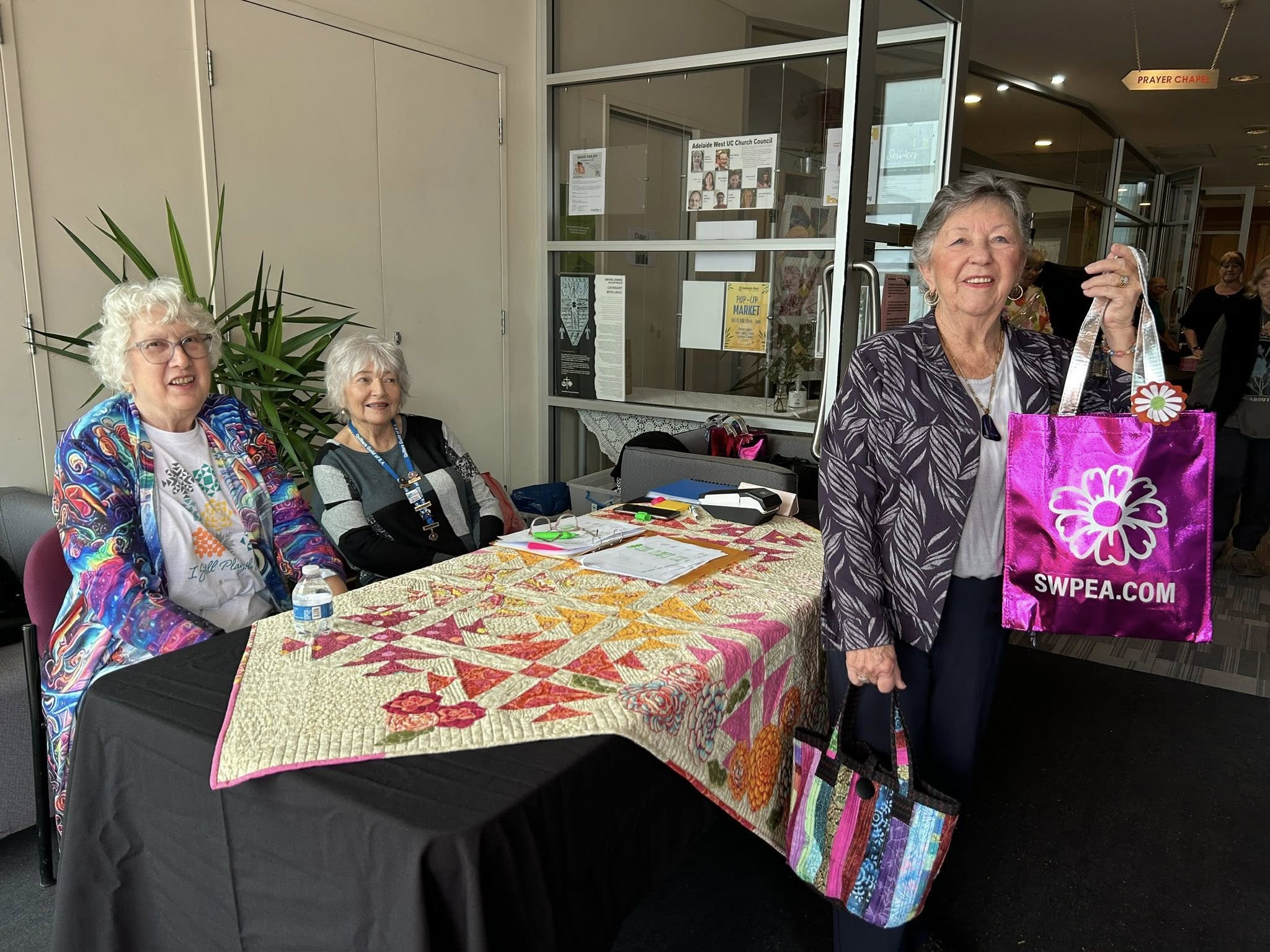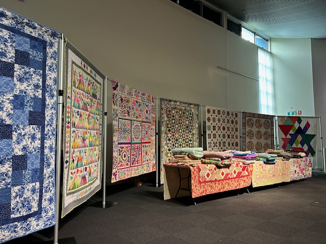 At the start of the day groups were invited to introduce their group and say a little about where they meet and what they do. An inspiring array of show and tell from the attendees was a joy to see. Attendees received a goody bag and took part in a lucky draw for a series of lovely give-aways. Two quilts and a goody basket were prizes for the raffle, funds raised to be donated to Puddle Jumpers, the SA Quilters charity for 2025.