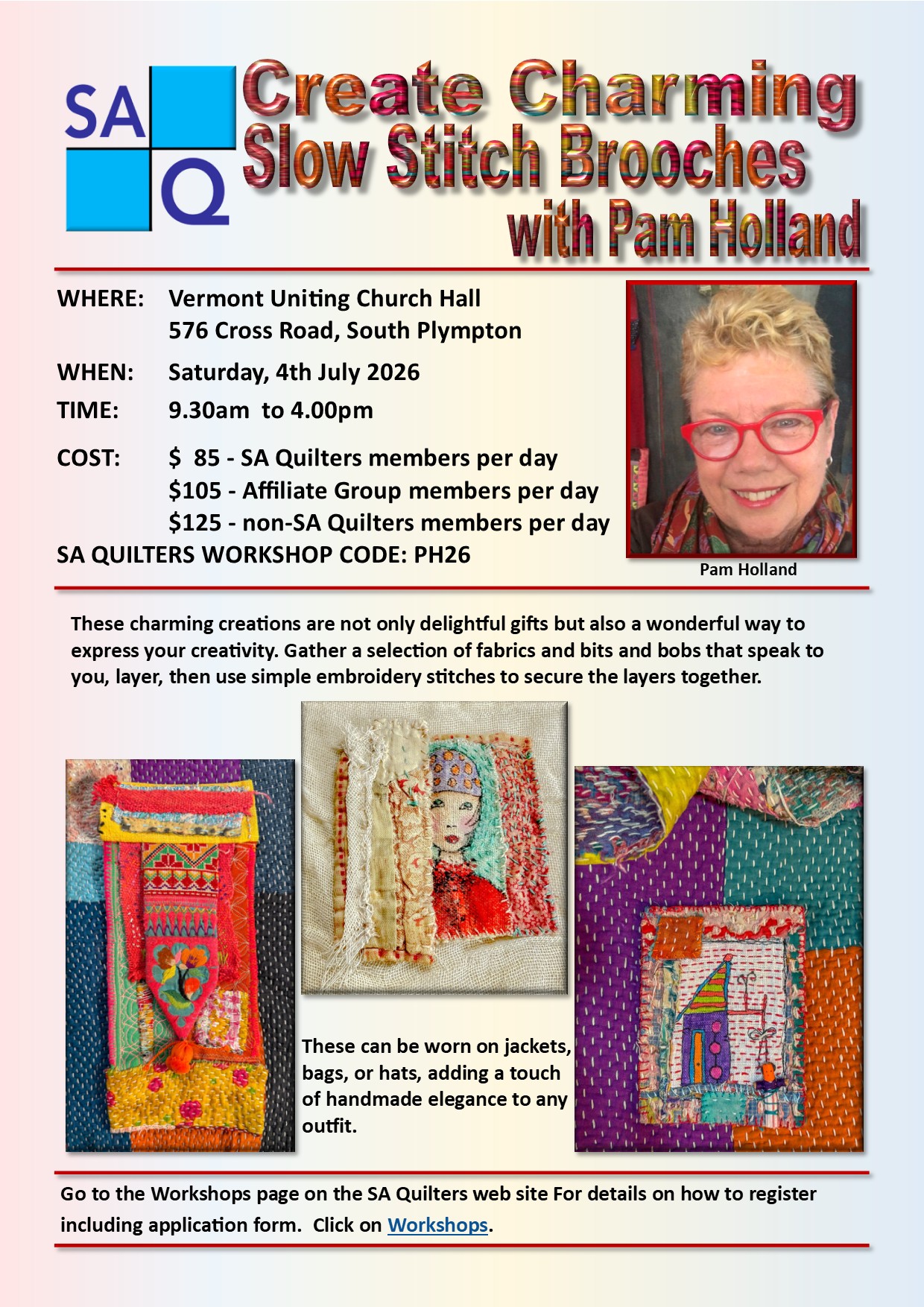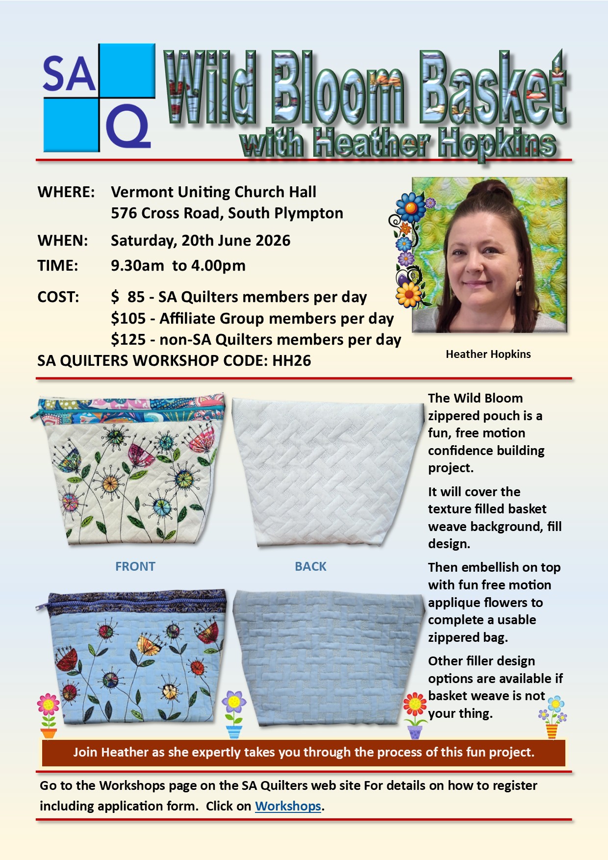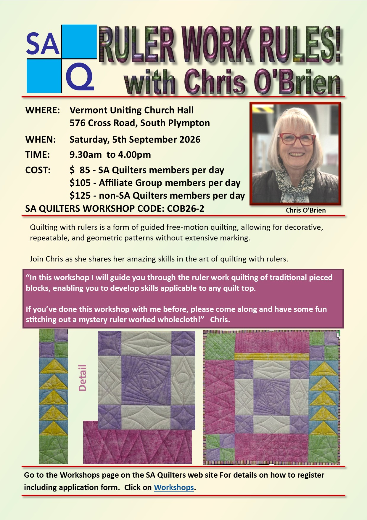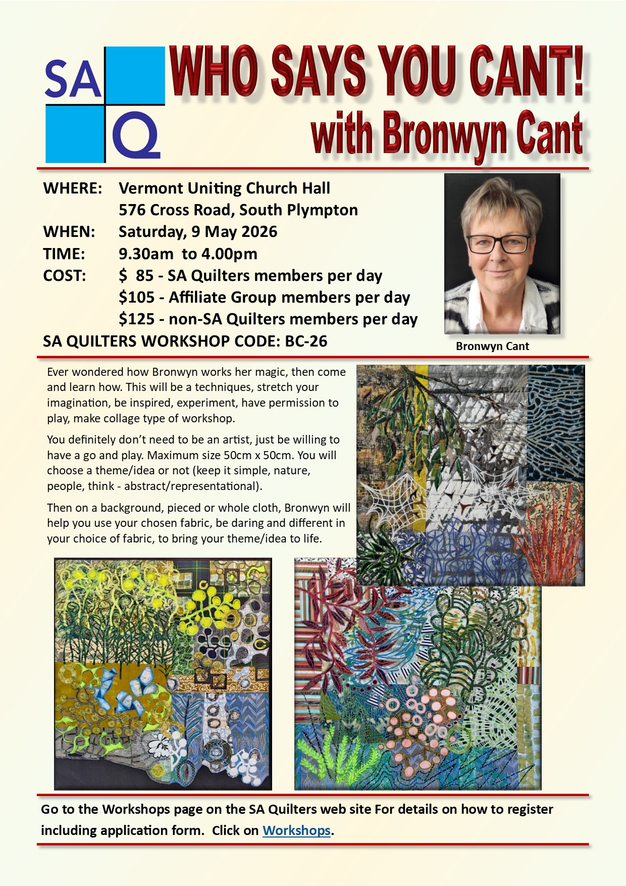 Fees are set to cover costs so are subject to change. SA Quilters affiliate group members pay an additional $20.00 and non-members pay an additional $40.00, per workshop, over and above the workshop fee for SA Quilters individual members.