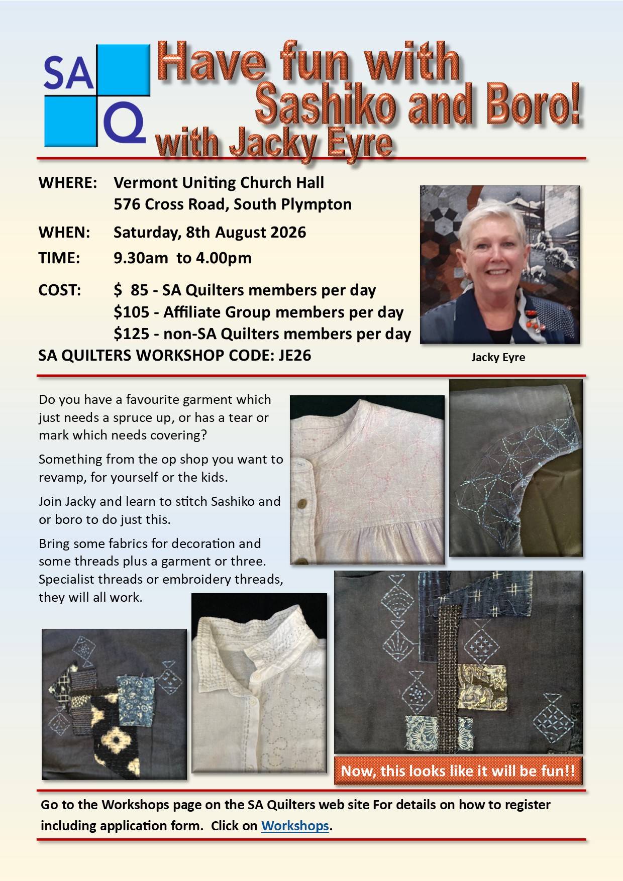 Details of planned workshops can be found published on this web site and on the SA Quilters Facebook page.